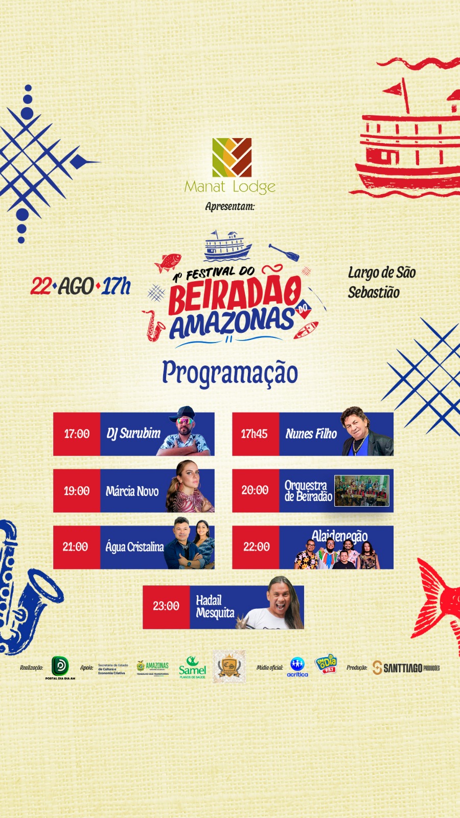 A primeira edição do Festival do Beiradão do Amazonas tem patrocínio do Manat Lodge e apoio do Governo do Amazonas, por meio da Secretaria de Cultura e Economia Criativa.